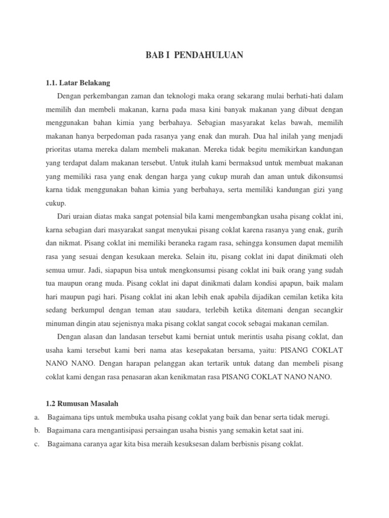 Doc Proposal Usaha Kripik Pisang Coklat Penyusun Gandha Saputra Xii Iis 2 Sma N 2 Pontianak Ganz Syo Academia Edu from 0.academia-photos.com Cara membuat puding pisang kepok: Parut pisang kepok, campurkan dgn kelapa parut, saus apel. Cara membuat keripik pisang coklat : Membuat bisnis plan atau rencana bisnis sangat membantu kelancaran bisnis dibanding dengan tidak! Pisang crispi isi coklat siap di sajikan untuk disantap. Cari tahu cara membuat nugget pisang keju yang rasanya kriuk dan gurih banget! Cara pemasaran produk yang satu ini semakin berkembang digunakan oleh banyak pebisnis dalam memasarkan produk dan layanannya. Pisang crispymakanan khas kamal yang jarang di produksi di area ketanggungan, oleh karena itu hal ini dapat membuat orang penasaran akan rasanya dan akan mencoba memakannya dengan cara membeli dari produk kami.